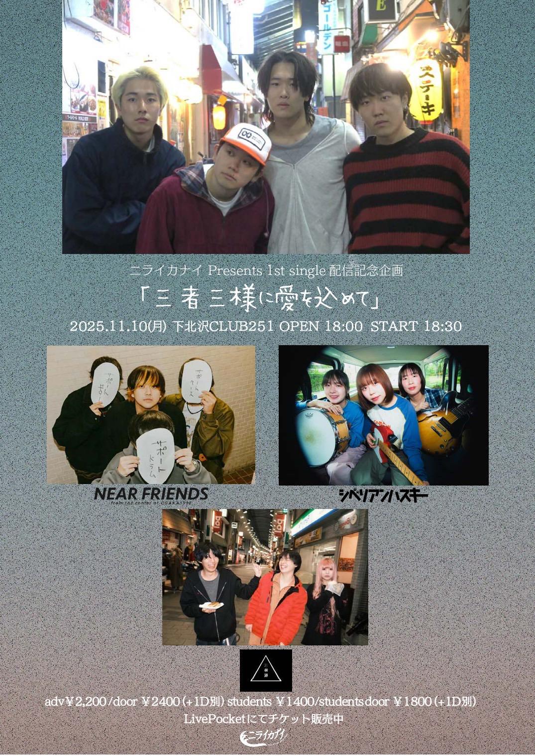 前売り:¥2,200 当日:¥2,400 Drink:¥600学生前売り¥1,400 / 学生当日¥1,800 -