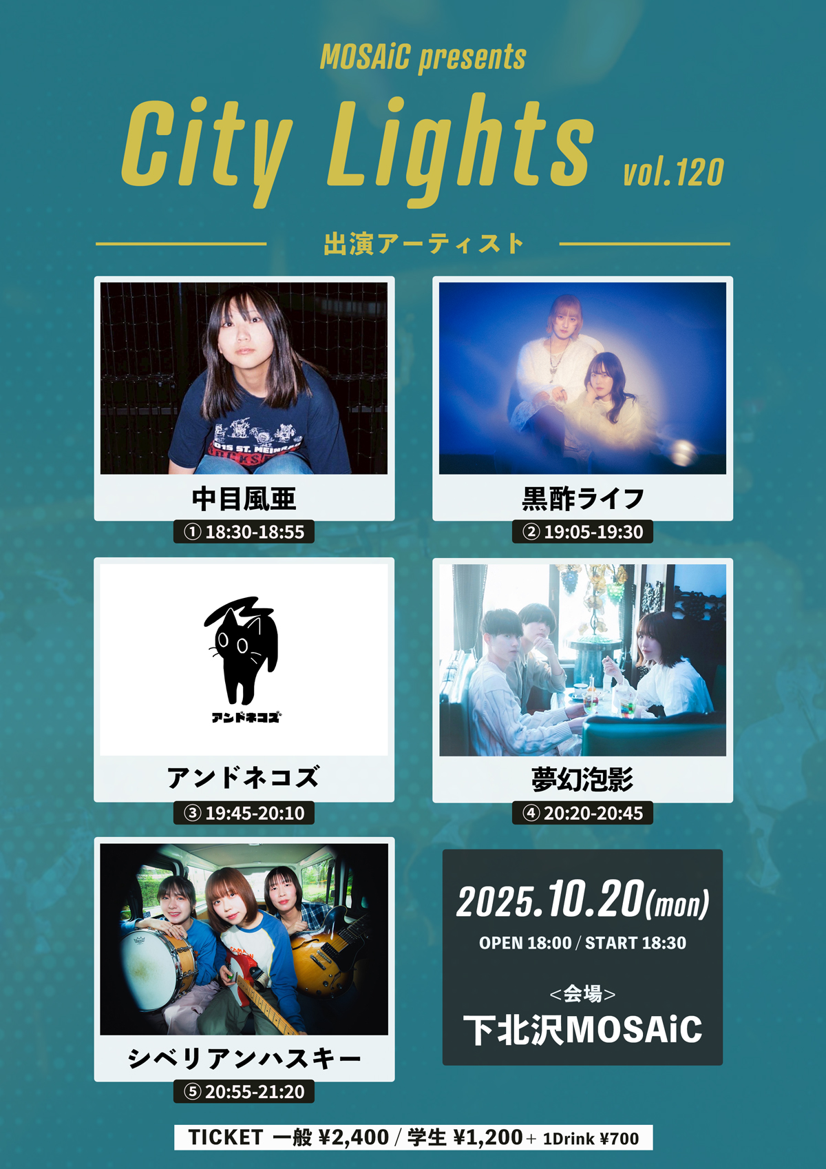 2025年10月20日(月)下北沢MOSAiCMOSAiC presents『City Lights vol.120』出演黒酢ライフ夢幻泡影シベリアンハスキー中目風亜